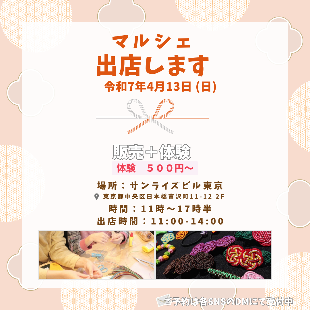 令和7年2月9日(日)、今年マルシェ初出店です。東京都内で行われるマルシェに出店する予定です。今回も前回初めての試みとして行った販売+体験で出店します。 混雑することが予想されますので、ご来場ご希望の方はDMなどでご連絡 […] -
